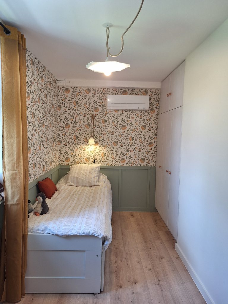 Marie a envie d’un papier peint d’inspiration anglaise, aux accents verts ou grenats. Il faut un nouveau bureau, une chaise moins massive et remplacer l’armoire qui n’est pas fonctionnelle. Et surtout; prévoir un couchage plus grand.